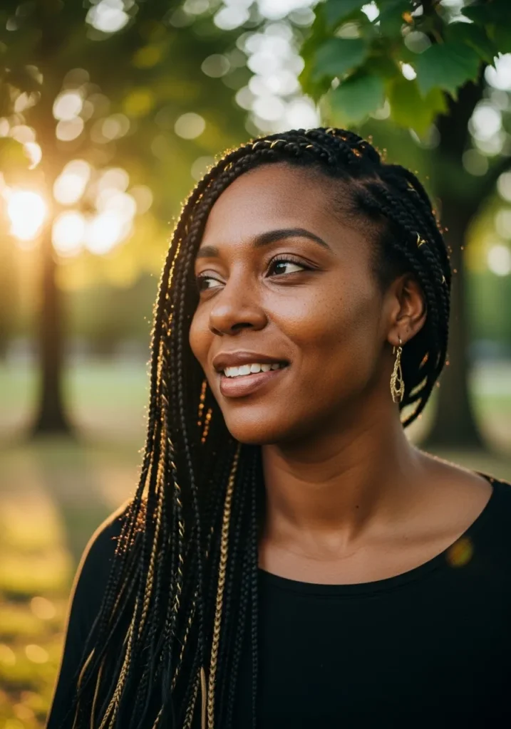 This style features waist-length box braids with subtle golden strands woven throughout. The sunlight catches the braids perfectly, adding warmth and glow. It’s simple, elegant, and full of personality.