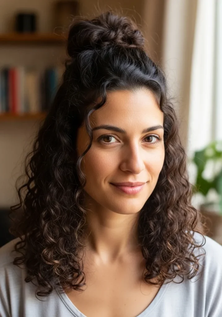 This hairstyle brings all the volume and texture. The top half is gathered into a loose bun while the rest of the curls fall freely, with a few tiny braids adding detail. It’s carefree, defined, and full of life.
