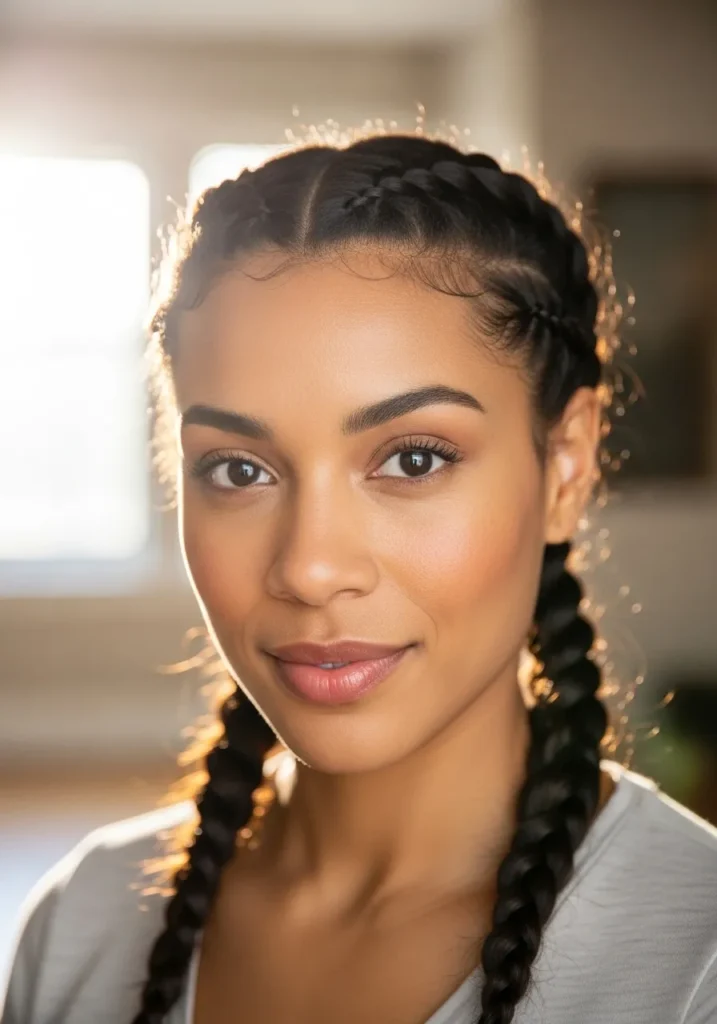 This look features two neat Dutch braids running smoothly from the hairline down to the ends, giving a sporty yet chic vibe. The braids are tight and glossy, highlighting the natural shine and healthy texture of the hair. Soft lighting adds warmth, keeping the style effortless and confident.