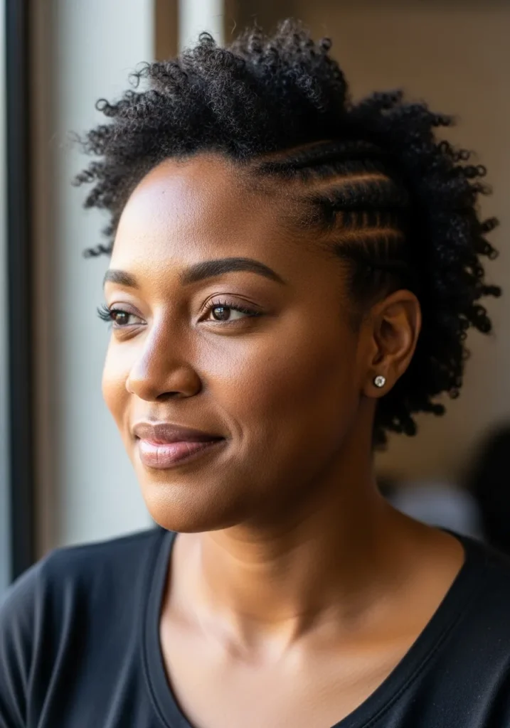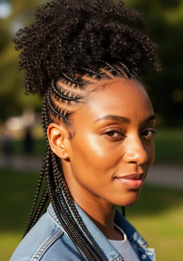 This hairstyle plays with contrast by combining sleek cornrows on one side with natural curls on the other. The tight braids add structure, while the curls bring bounce and personality. The result feels modern, bold, and full of movement.