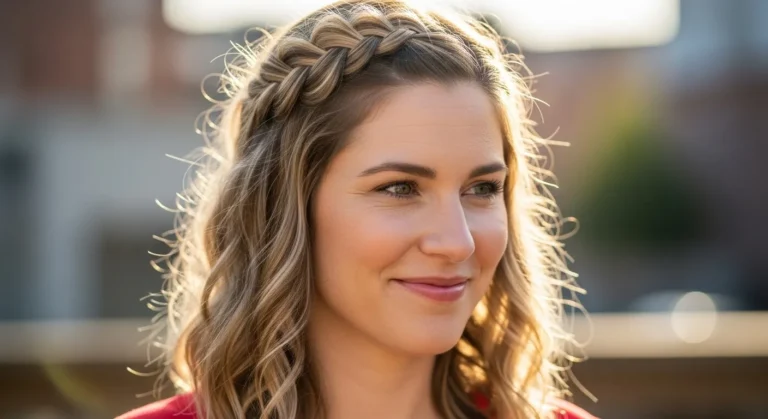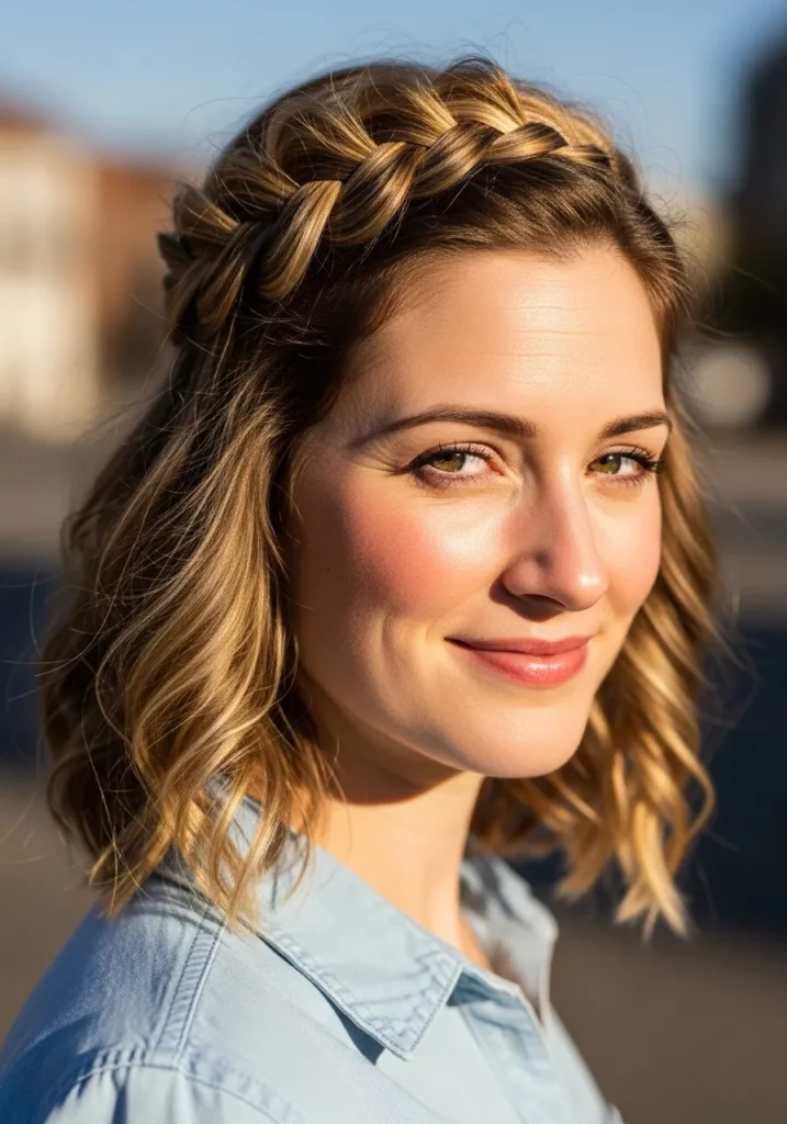 This hairstyle features a chunky braid styled across the crown like a headband, paired with short, softly curled waves. The golden-blonde tones shimmer in the sunlight, creating a radiant and feminine finish.