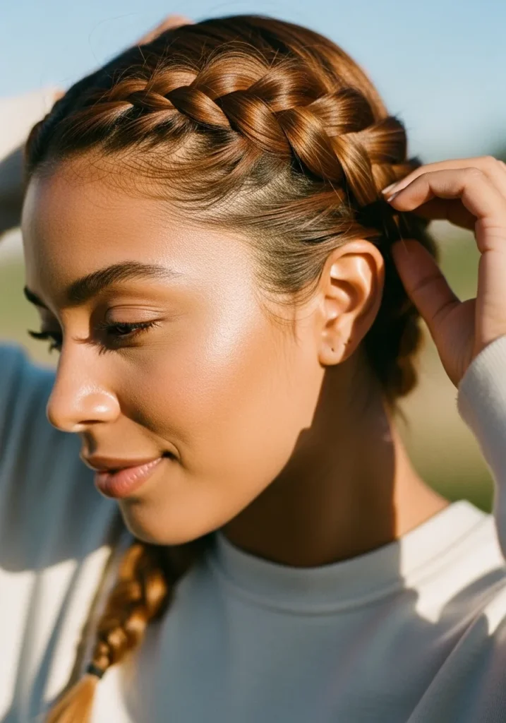 This style features a smooth pair of Dutch braids framing the crown and wrapping into a low braid at the back. The rich caramel hair shines softly in natural light, giving the look an elegant yet casual feel.