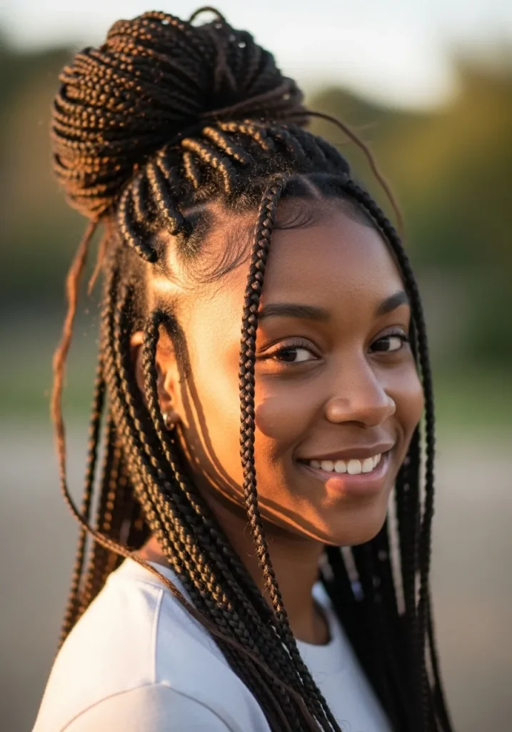 This hairstyle features long box braids gathered into a voluminous high bun. A few braids are left loose in the front, framing the face and adding softness to the look. The sunlight brings out a warm sheen in the hair, creating a radiant and confident finish.