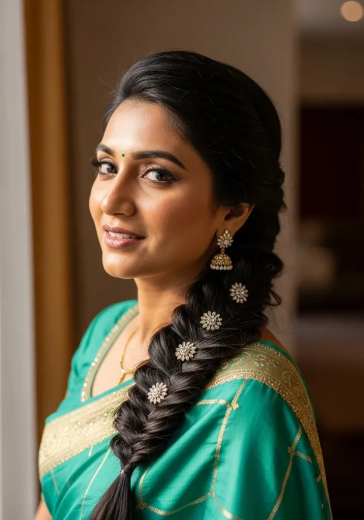 This braid is all about detail. Thick, jet-black hair is styled into a dramatic fishtail braid and adorned with sparkling floral clips that catch the light with every move. The look feels rich, textured, and festive.