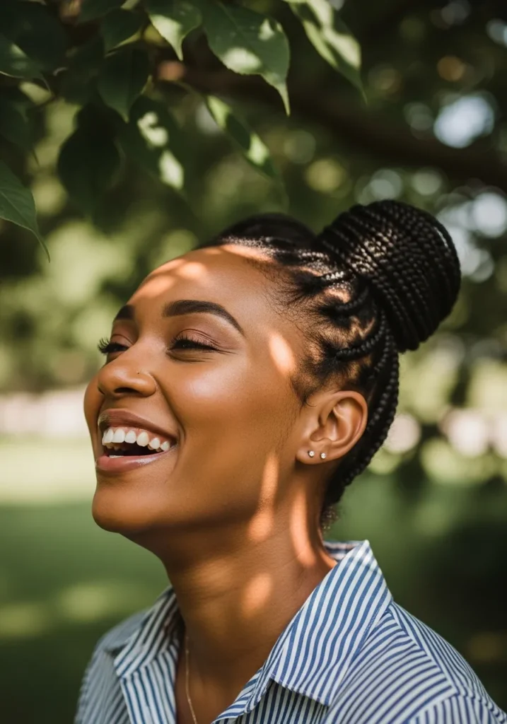 This hairstyle features intricate cornrow braids pulled neatly into a high bun. The structure adds boldness while the shine gives it a sleek, polished finish. It’s equal parts fun and confident.