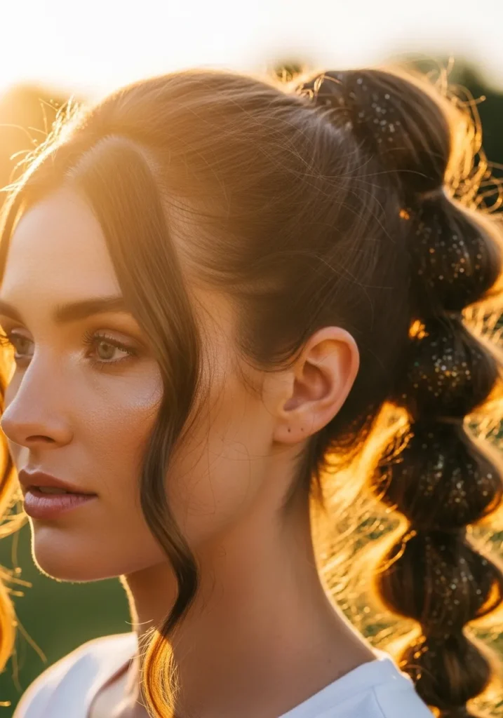 This hairstyle features a sleek high ponytail styled into voluminous bubble sections with a touch of shimmer. The golden-brown hair catches the sunlight beautifully, while soft face-framing strands add a romantic touch. It feels polished yet playful, making it perfect for a festive night out.