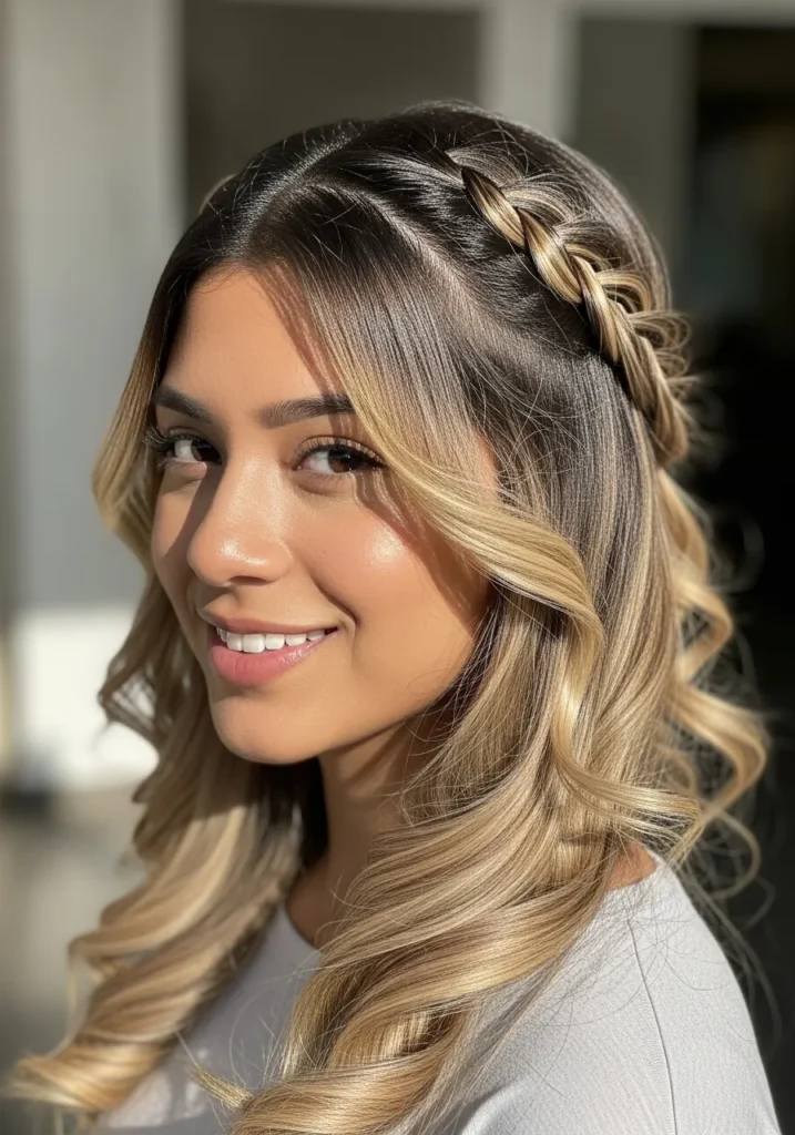 This dreamy look features a loose waterfall braid that blends into cascading waves of honey-blonde hair. The curls are soft and defined, catching the light for a sunlit glow that feels both romantic and fun.