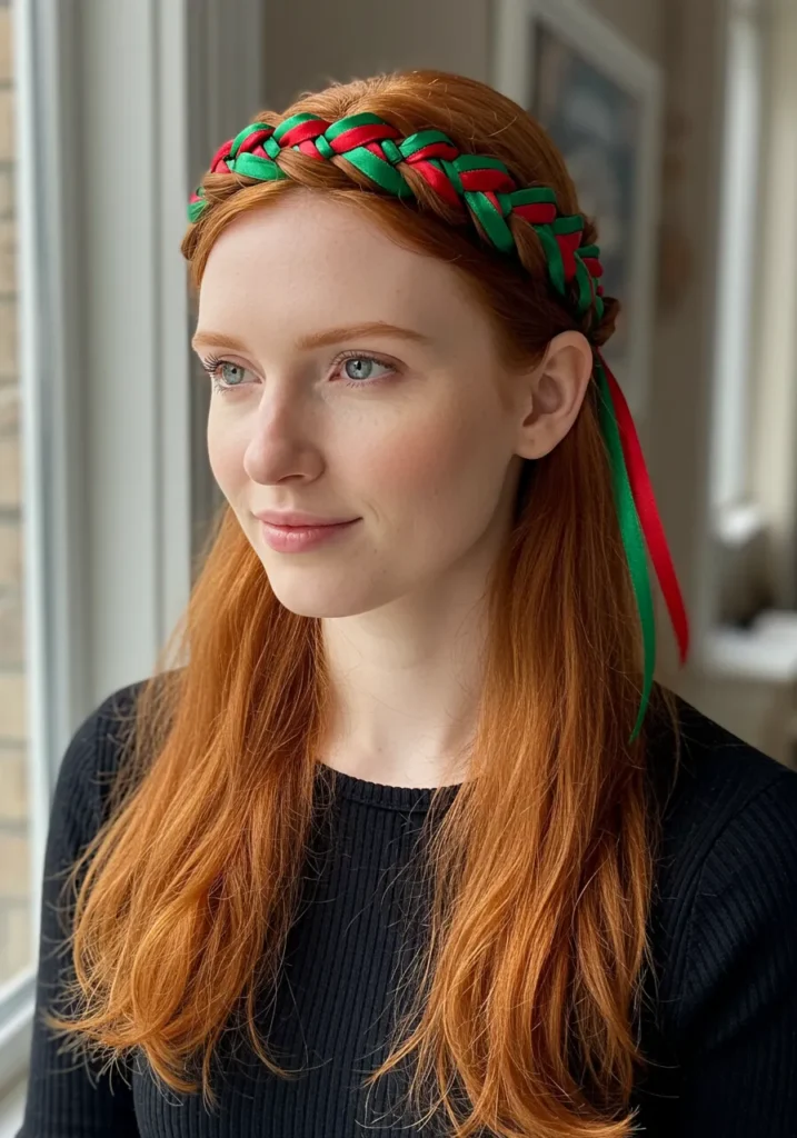 Long straight auburn hair becomes instantly festive with a thick braid woven across the crown, intertwined with green and red ribbons. The rest of the hair flows naturally down the shoulders, creating a balanced and whimsical contrast. The ribbon detail feels playful yet intentional, like a handmade touch to a Christmas morning outfit.