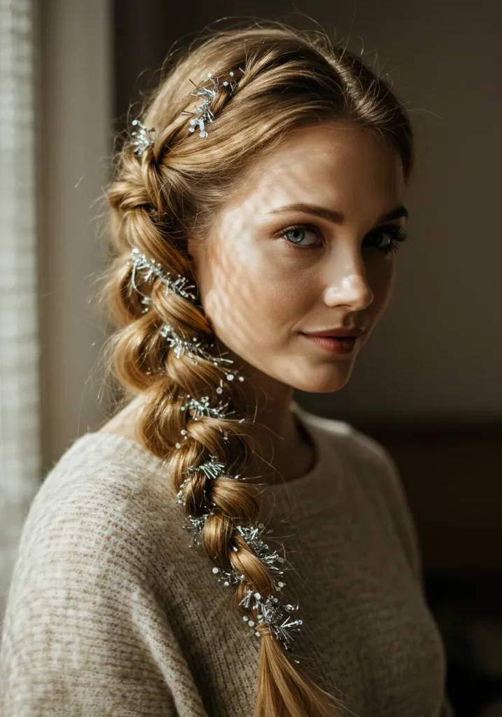 A thick, structured braid runs over one shoulder, woven with delicate silver sprigs that glisten like frost on winter branches. The golden-blonde hair adds warmth, while the shimmer gives the whole style a festive glow. It’s detailed yet feels effortless.