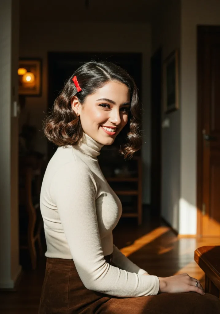 Short, glossy waves are parted to the side, held in place with a bright red clip that adds just the right pop of color. The curls have smooth definition and shine, giving the style a polished vintage feel that still feels modern and youthful.