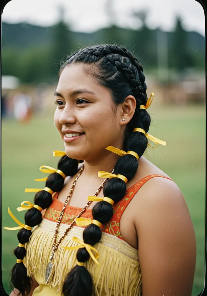 Thick, glossy braids cascade down on each side, tied neatly with cheerful golden ribbons that catch the light beautifully. The hair is parted and braided tightly at the crown, keeping everything smooth and in place while allowing the ribbons to bring the festive flair. The style feels bold yet playful, full of personality and warmth.