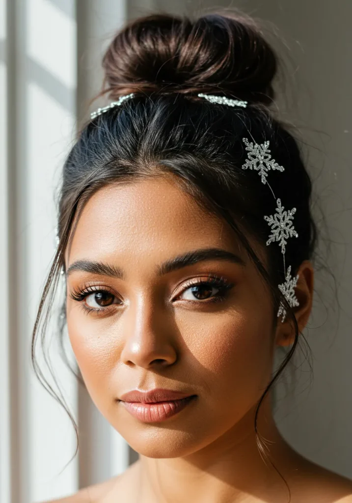 This elegant updo gathers dark, glossy hair into a soft top bun, while sparkling snowflake clips frame the face. A few delicate strands fall loose for that effortless, romantic touch. The shimmer from the snowflakes catches the light perfectly, giving it a frosty, winter wonderland vibe.