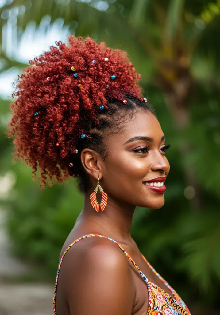 This fun, high ponytail bursts with tight red curls, dotted with tiny colorful beads that bring a playful twist to the festive season. The curls have amazing volume and texture, and the beads reflect light with every movement, creating a joyful, energetic look.