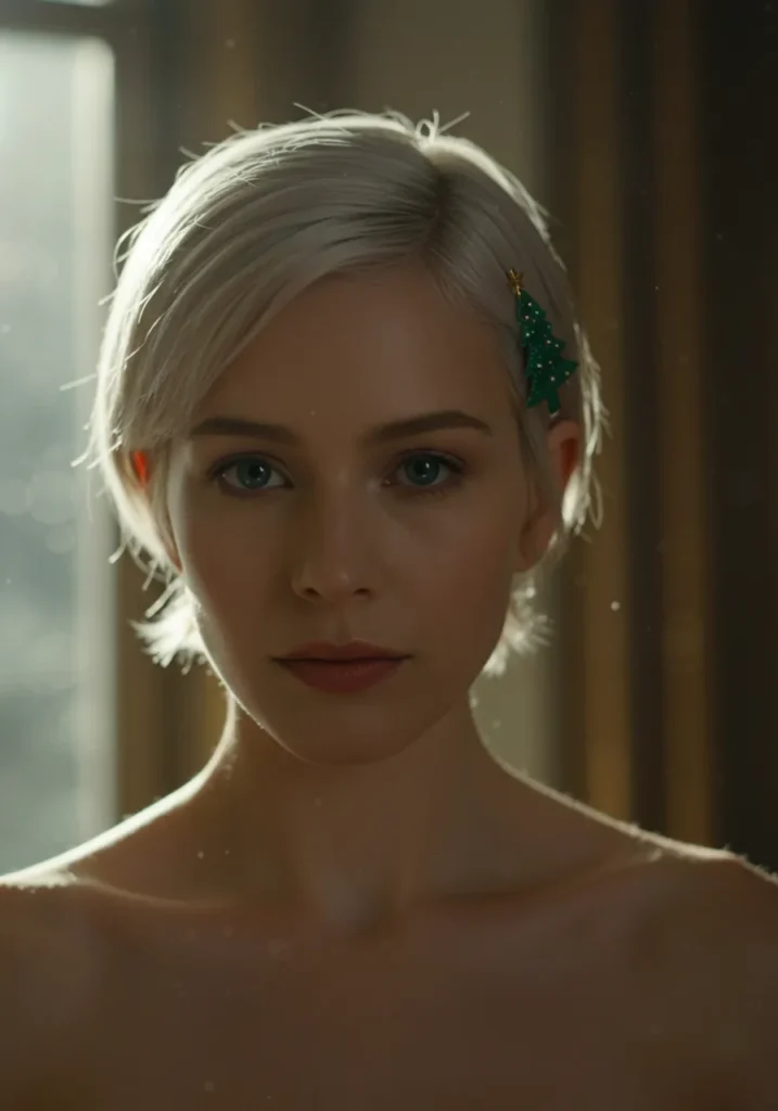 This sleek, platinum-blonde pixie cut feels both chic and whimsical with a tiny green Christmas tree clip tucked to one side. The smooth layers give it structure and shine, while the accessory adds a touch of humor and charm. It’s understated yet full of festive spirit.