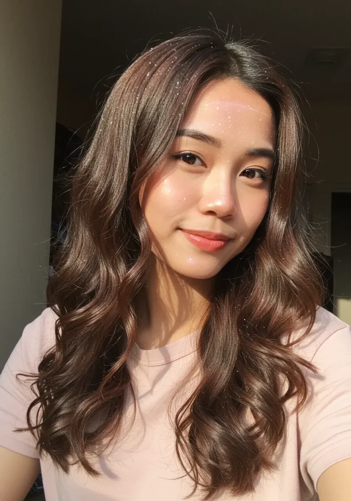 Long, loose waves flow naturally with a soft, glossy finish and subtle glitter sprinkled through the hair. The warm brown tones glow under the light, giving off a soft, radiant energy. The overall effect is delicate and romantic, perfect for any festive gathering.
