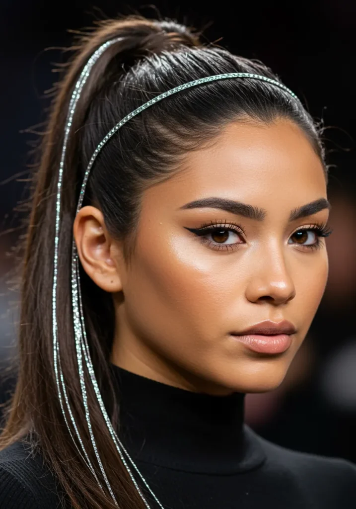 This sleek ponytail is high, smooth, and full of shine. The straight dark hair is pulled tightly to the crown, and fine glittering strands are woven through the ponytail, catching every bit of light. It’s modern, bold, and made for anyone who loves a little shimmer with their confidence.