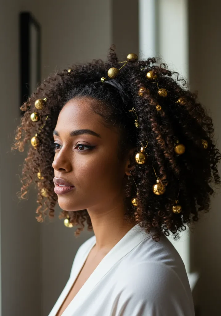 This gorgeous hairstyle celebrates natural curls by turning them into a festive statement. The bouncy ringlets are full of texture and movement, dotted with small golden ornaments that sparkle playfully under the light. The deep, rich tones of the hair make the gold pop beautifully, giving it a luxurious and creative Christmas flair.
