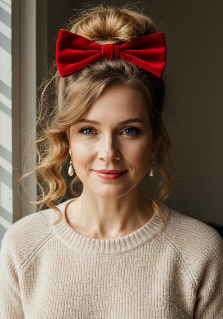 A fluffy, textured bun sits high on the head, framed by loose face-framing curls that soften the look. The highlight of the style is the oversized red velvet bow that instantly makes it feel festive and charming. The hair’s soft blonde tones add warmth that complements the bold accessory perfectly.