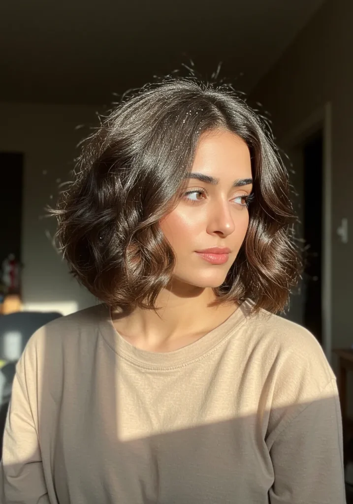 Medium-length dark brown hair styled in glossy waves gives this look a sophisticated, understated charm. The layers bounce with movement, and a sprinkle of subtle glitter dust catches the light like snowflakes. The cut itself feels timeless, but the shimmer adds that extra seasonal flair.