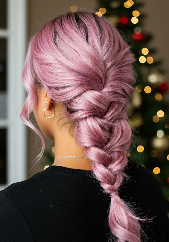 This thick, voluminous braid flows down the back, with soft waves and face-framing pieces that make it feel romantic. The pastel pink shade brings a bold yet feminine twist, especially with the smooth finish that gleams under warm lighting. It’s daring, dreamy, and unmistakably creative.