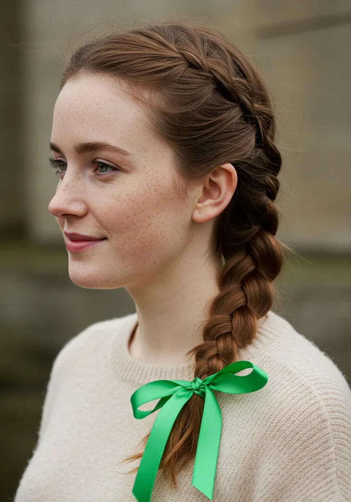 A neatly woven side braid falls over one shoulder, tied off with a vibrant green ribbon that pops against the chestnut brown hair. The braid is smooth and tight, keeping things tidy while still looking soft and natural. It’s simple but instantly feels holiday-ready with that little touch of color.