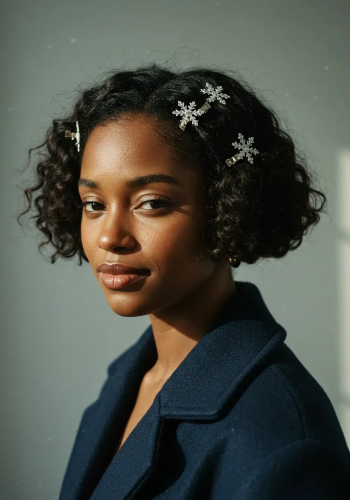 This short curly hairstyle feels joyful and fresh with defined ringlets that catch the light beautifully. The deep side part adds a touch of softness around the face, while delicate snowflake clips shimmer playfully in the curls. The natural texture gives it an easy, relaxed feel that looks effortless yet festive.