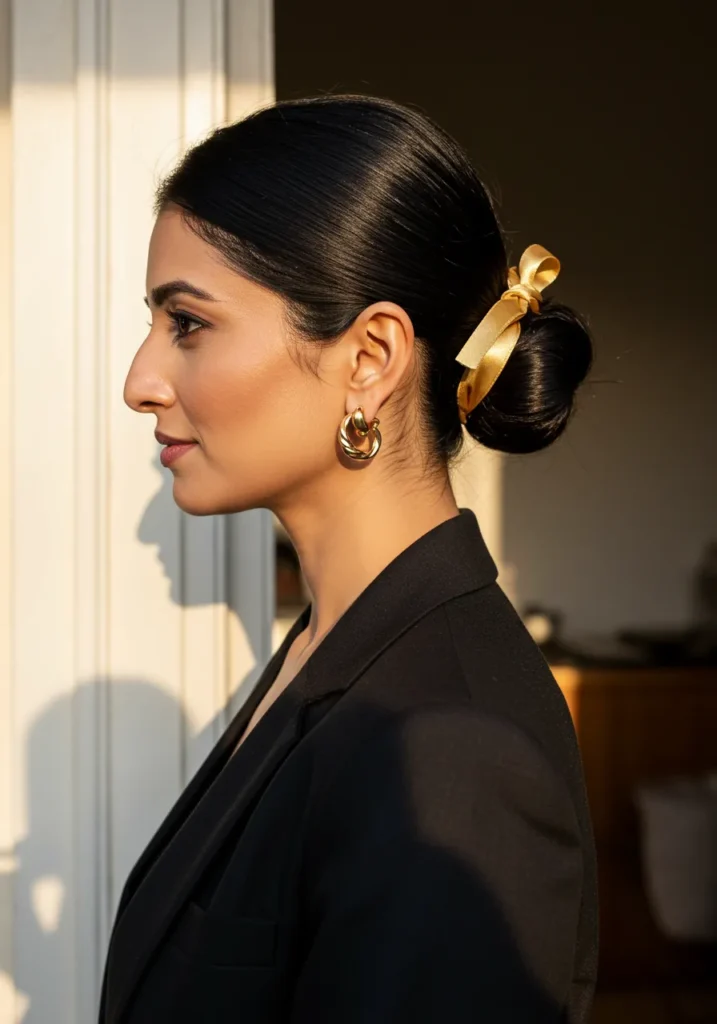 This sleek, glossy bun sits neatly at the nape, tied off with a small golden ribbon that adds a soft touch of holiday glamour. The black hair gleams in natural light, perfectly smoothed with no stray hairs in sight. The look is elegant and minimalistic but never dull.