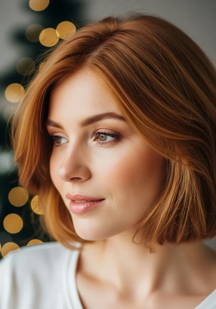 This short red bob shines with warmth and simplicity. The soft, straight layers frame the face beautifully while the copper tone catches the light, giving it that New Year’s sparkle without needing a single accessory.