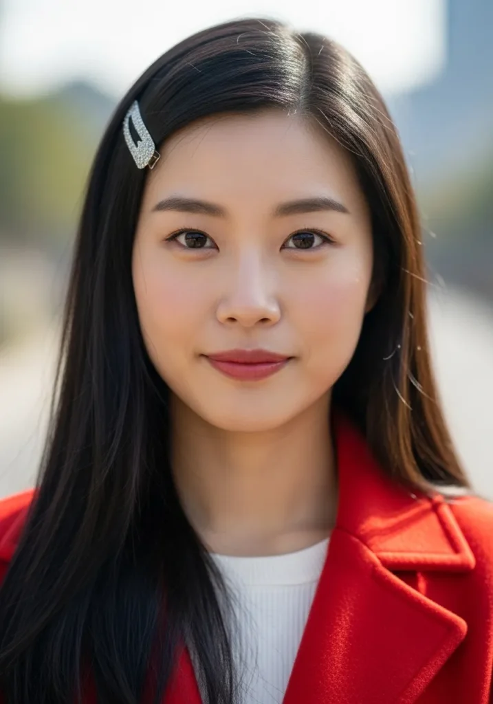 This hairstyle keeps things simple but stunning. The long, straight black hair is styled with a clean middle part and finished with a sparkly silver clip pinned to one side. It’s minimal, chic, and full of quiet confidence.