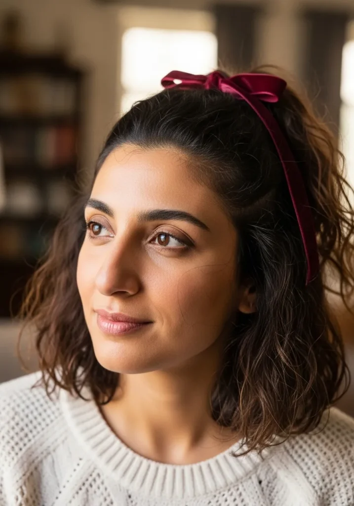 This look features short, wavy hair gathered into a half-up ponytail and tied with a deep burgundy velvet ribbon. The waves add movement, while the bow brings a sweet and slightly vintage feel that’s perfect for a cozy winter party.