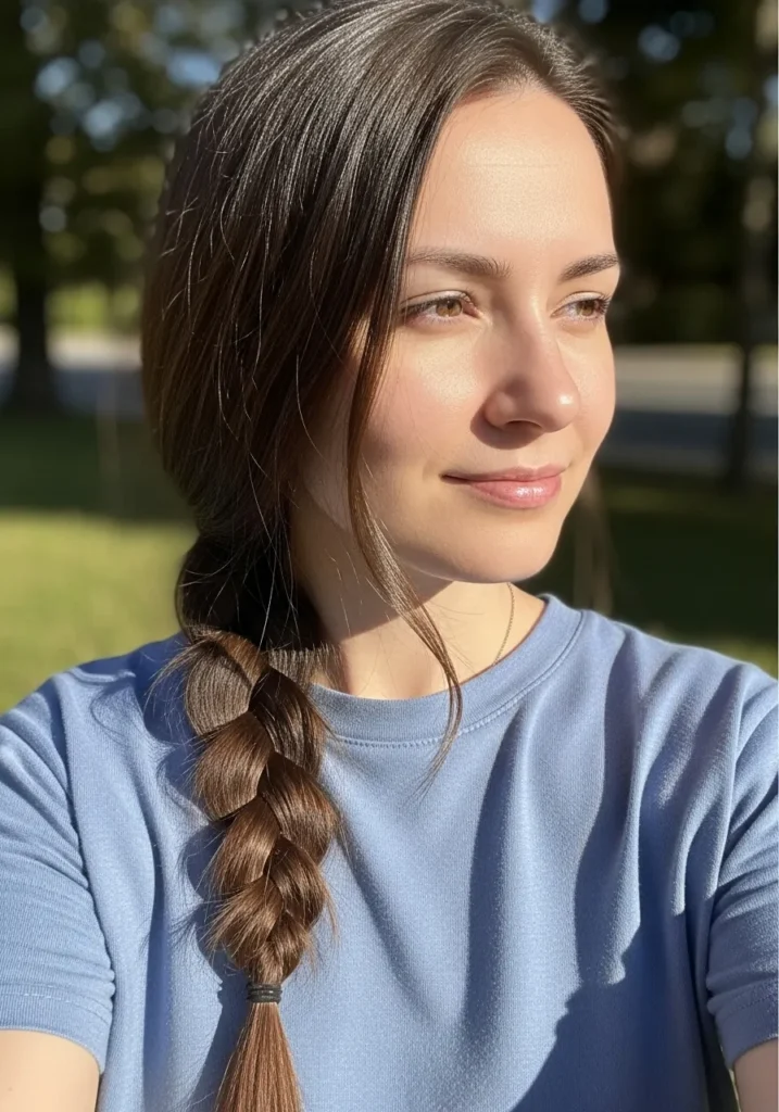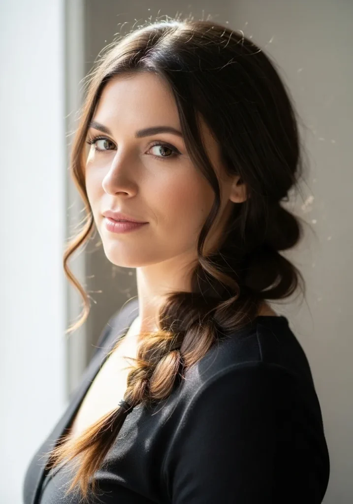 This easy hairstyle keeps things classic with a single side braid. The straight, shiny brown hair is loosely braided with a few pieces left out to soften the look. It’s simple, practical, and looks great no matter the occasion.