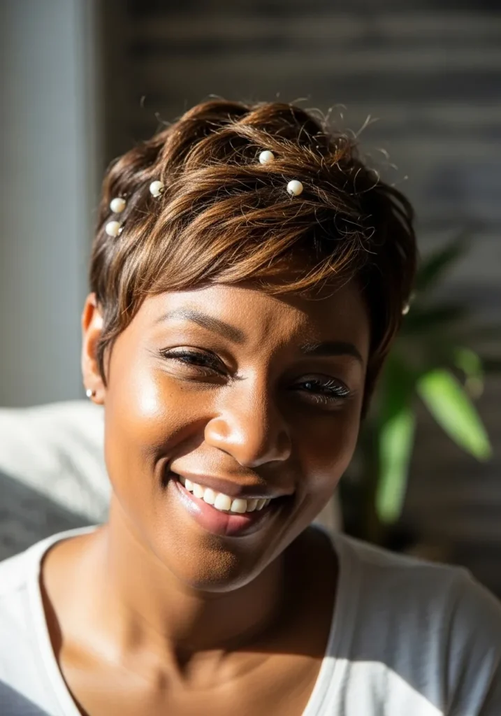 This short, cropped hairstyle is full of personality. The hair is styled with a touch of texture, and small pearl accents are scattered throughout for a festive, playful twist. The warm brown highlights make it even more eye-catching.