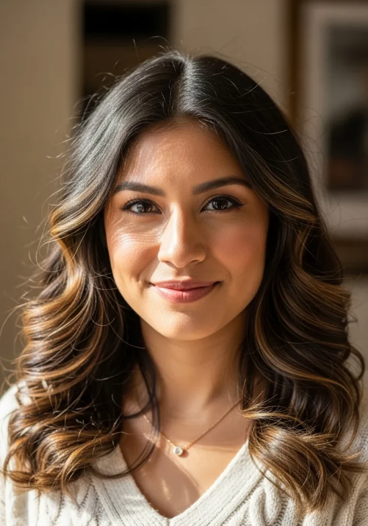 This mid-length hairstyle has soft, flowing waves with warm caramel highlights that catch the light beautifully. The waves are loose and bouncy, giving that perfectly undone look that’s flattering on everyone.