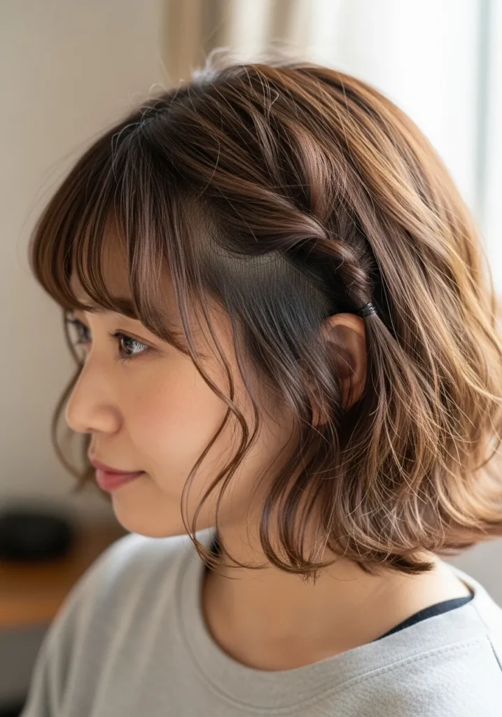 This short wavy hairstyle is styled with a small twist along the side, secured with a discreet elastic. The rest of the hair is left loose and natural, with airy texture and soft layers framing the face.
