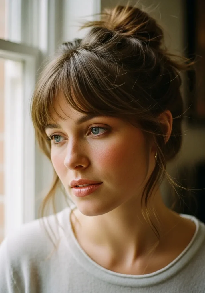 This look features a relaxed messy bun paired with wispy bangs that gently frame the face. The soft brown tones and a few loose strands around the cheeks make the style look naturally effortless and full of texture.