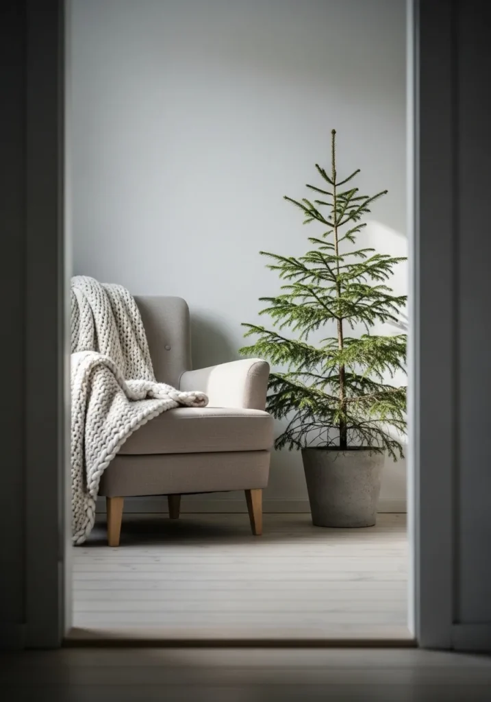 This cozy corner captures the essence of minimalist Christmas elegance. A slender potted evergreen stands gracefully beside a soft beige armchair, draped with a chunky knit blanket that instantly adds texture and warmth. The neutral palette of pale wood floors and soft grey walls keeps the space calm and uncluttered, allowing the simplicity of the season to shine without the need for excessive décor.