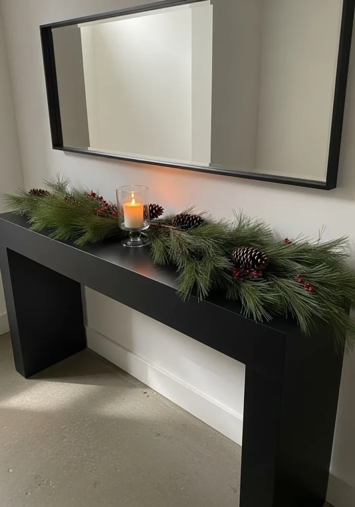 This minimalist entryway shows how simplicity can still feel festive and warm. A sleek black console stands out against clean white walls, topped with a natural garland of pine branches, pinecones, and subtle red berries. A single glass candle adds a soft golden glow that reflects beautifully in the mirror above, creating a cozy yet refined ambiance. The whole setup feels balanced, uncluttered, and quietly luxurious—like a calm welcome into the season.