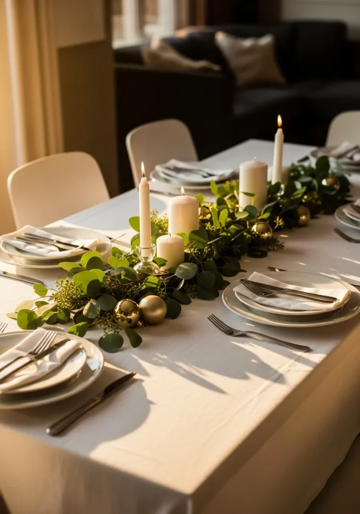 This minimalist Christmas dining setup is all about calm elegance. A crisp white tablecloth sets the tone, while lush eucalyptus branches stretch gracefully along the center, paired with simple white candles and a few soft gold ornaments for a hint of holiday shimmer. The symmetry, clean lines, and soft candlelight make the whole table feel both cozy and sophisticated, perfect for an intimate dinner that still feels festive.