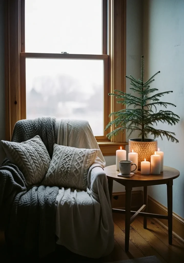 This space perfectly captures the quiet magic of minimalist Christmas style. A soft armchair is layered with chunky knit blankets and textured cushions that practically invite you to curl up with a cup of cocoa. The wooden side table holds a petite evergreen tree in a ceramic pot, surrounded by flickering candles that cast a warm, golden glow against the cool winter light pouring through the window. Every detail whispers comfort without feeling cluttered.