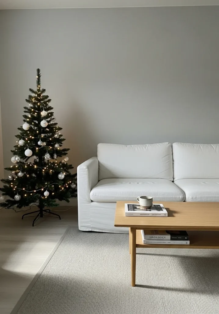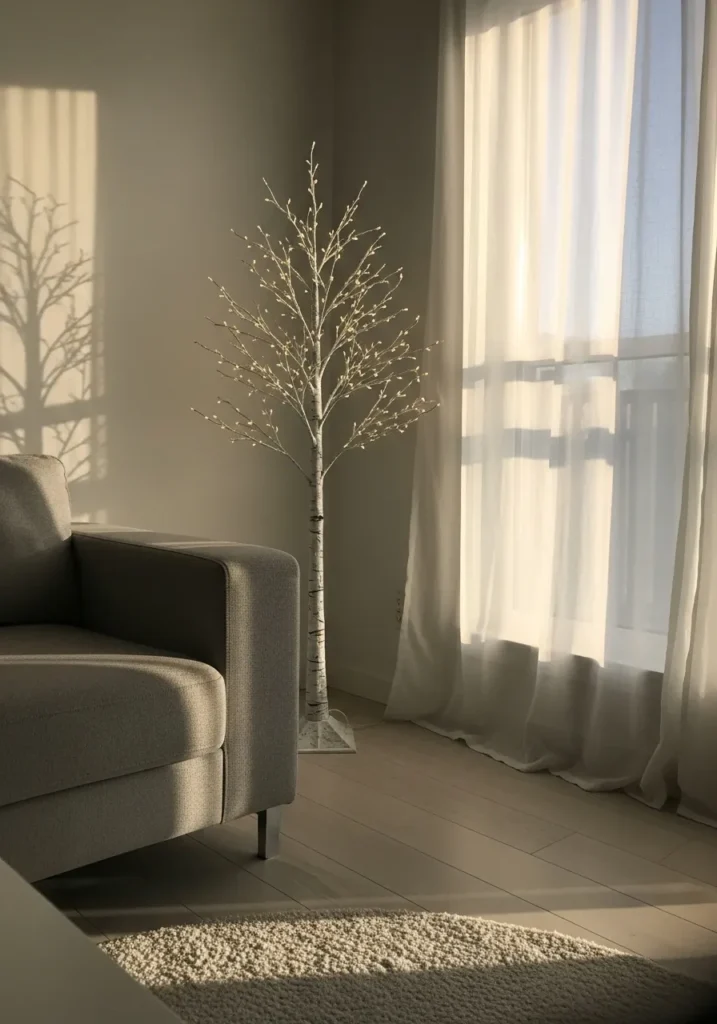 This space captures the essence of calm simplicity with its clean lines, neutral tones, and soft natural light filtering through sheer curtains. A simple birch-style LED tree adds a subtle festive glow without overwhelming the room, perfectly complementing the muted beige sofa and textured rug. Every element feels intentional yet effortless, creating a quiet harmony that feels both modern and inviting.
