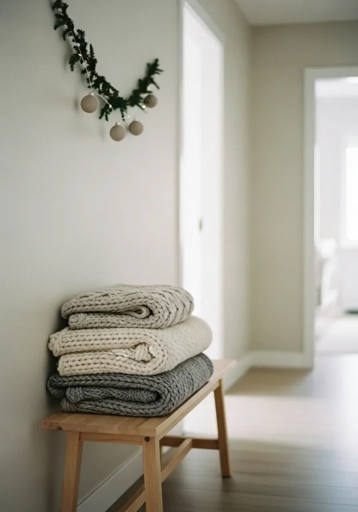 This hallway is the picture of minimalist serenity with its clean walls, soft lighting, and simple wooden bench topped with neatly folded chunky knit blankets in shades of cream and gray. A small garland of evergreen branches with natural-toned ornaments adds a whisper of Christmas charm without overwhelming the space. Everything feels calm, uncluttered, and beautifully intentional.