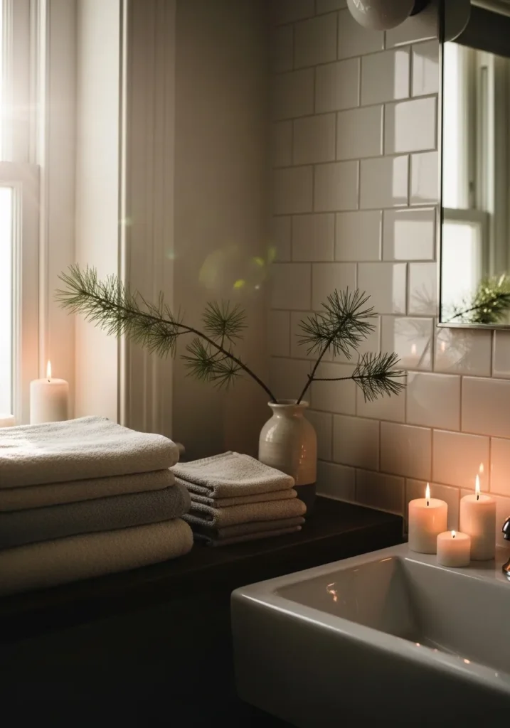 This minimalist bathroom captures the quiet beauty of Christmas in the simplest way possible. Clean white tiles, soft folded towels, and the gentle flicker of candles set a spa-like mood that feels instantly grounding. A single pine branch in a cream ceramic vase brings in just the right amount of seasonal charm without overwhelming the calm palette. The natural light streaming through the window reflects off the glossy tiles, creating a warm, serene space that feels both festive and soothing.