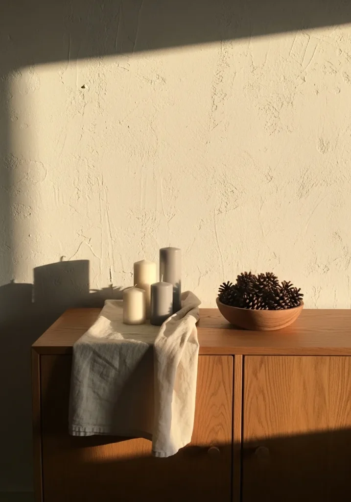 This minimalist Christmas setup captures the quiet beauty of natural textures and gentle light. A wooden sideboard holds a few pillar candles in soft gray and cream tones, paired with a simple linen cloth that drapes casually over the edge. A wooden bowl filled with pinecones adds just the right touch of rustic charm without overwhelming the calm simplicity of the space. The sunlight streaming across the wall gives everything a warm, peaceful glow that feels effortlessly elegant.