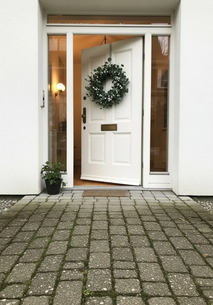 This entryway captures everything I love about minimalist Christmas decor. The crisp white door framed by clean architecture feels fresh and modern, while the lush eucalyptus wreath adds a soft touch of greenery and subtle seasonal cheer. The simple potted plant and warm interior light peeking through the doorway balance the scene perfectly, creating an atmosphere that feels both calm and inviting.