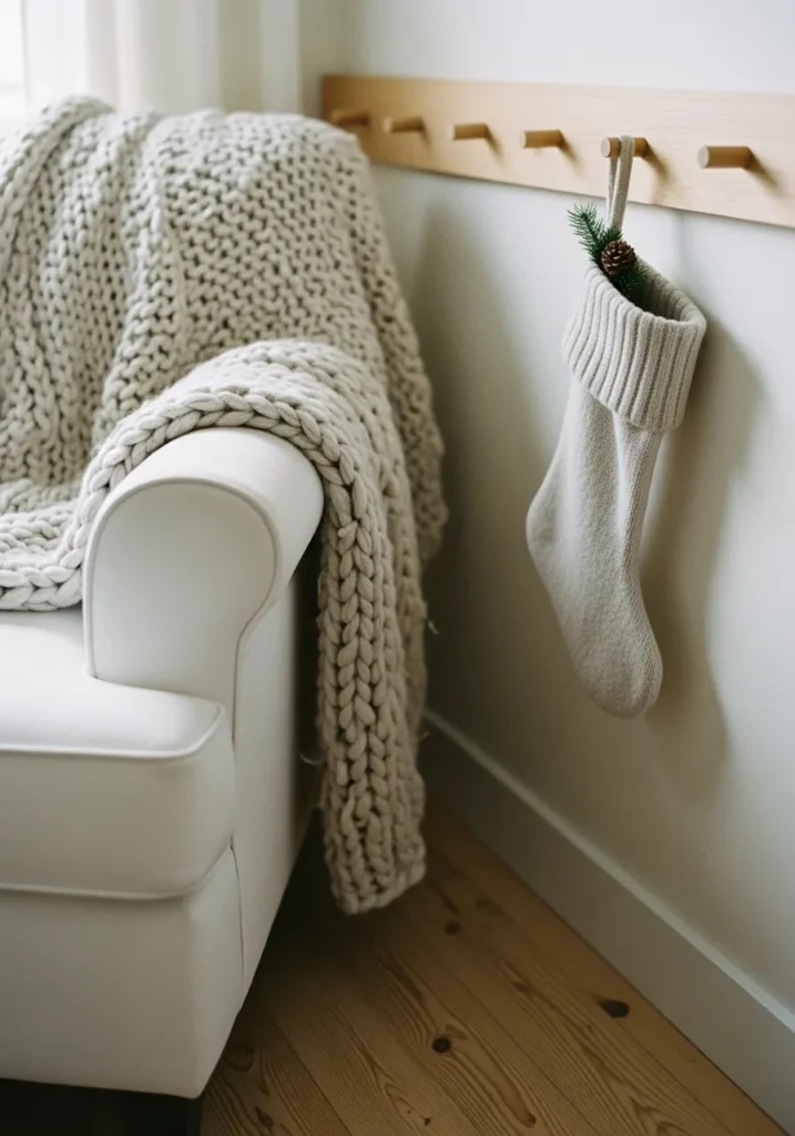 I absolutely love how this setup feels so inviting yet effortlessly stylish. The chunky knits make me want to wrap myself up and stay cozy all day, while the subtle holiday greenery adds just enough festive spirit to make it feel special. It’s proof that you don’t need glitter or grand displays to create Christmas warmth—sometimes simplicity really is the most sophisticated statement.