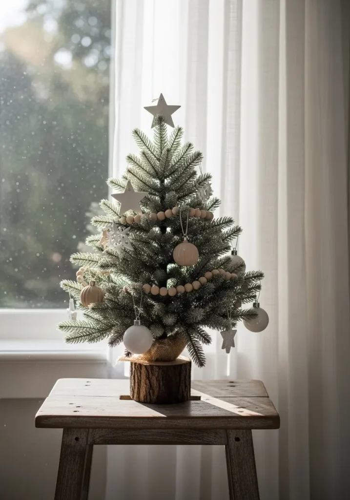 This petite Christmas tree sits perfectly on a rustic wooden stool, showing that even the simplest setup can feel wonderfully festive. Its frosted branches are dressed with soft wooden beads, white ornaments, and star accents, creating a calm and understated charm. The natural textures of wood and greenery are beautifully highlighted by the soft daylight streaming through sheer curtains, giving the whole scene that peaceful holiday glow we all crave.