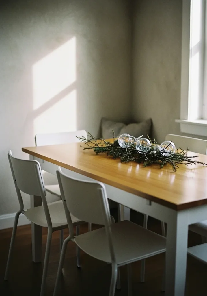 This minimalist dining space captures that calm, winter-morning feeling we all crave during the holidays. The light wood table and clean white chairs create an airy and open mood, while the simple branch centerpiece with clear ornaments brings just the right touch of Christmas without overpowering the room. Natural light spills softly through the window, adding warmth and life to the pared-back setting.