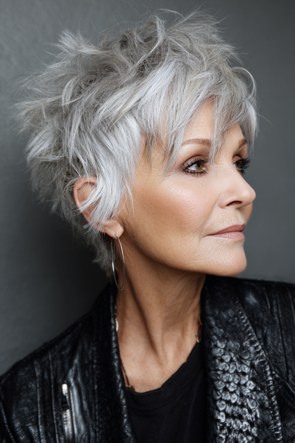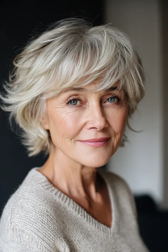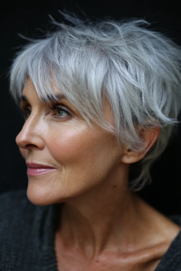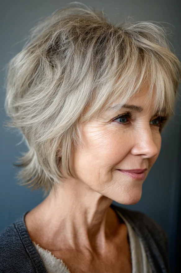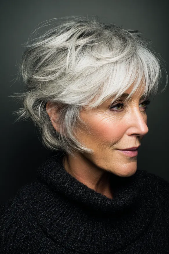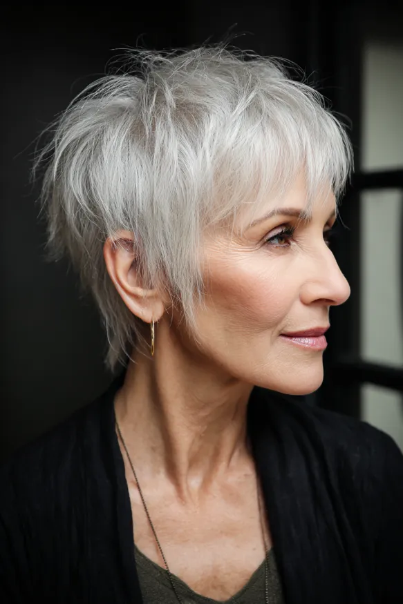 This short layered pixie is all about soft texture and movement. The layers are feathered and slightly tousled, giving it a playful yet elegant look. The icy silver tone adds a modern edge while blending naturally with gray hair, making it feel effortless and striking. The wispy bangs skim the forehead, framing the face in the most flattering way without feeling too heavy or styled.