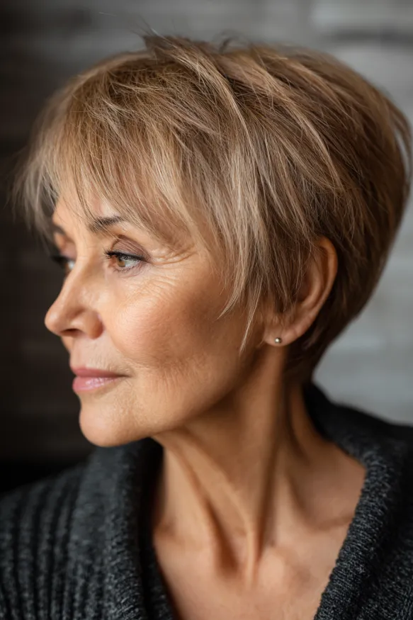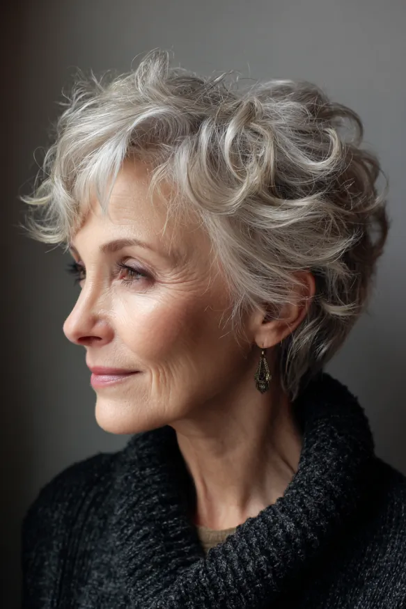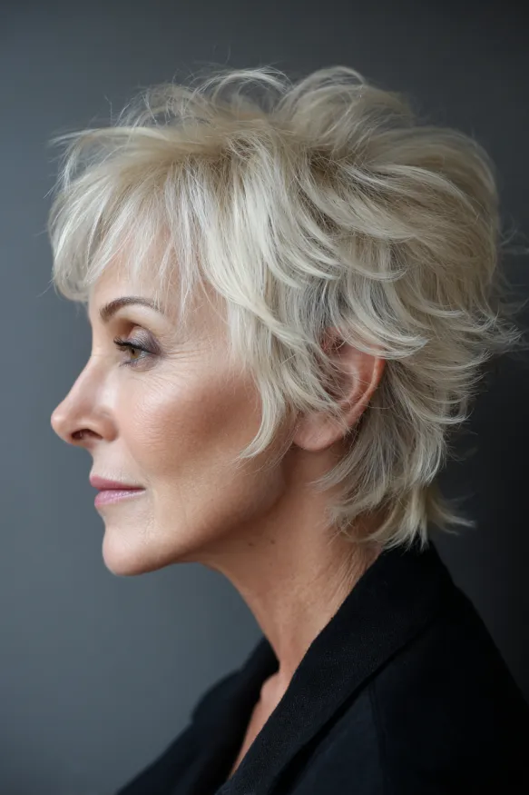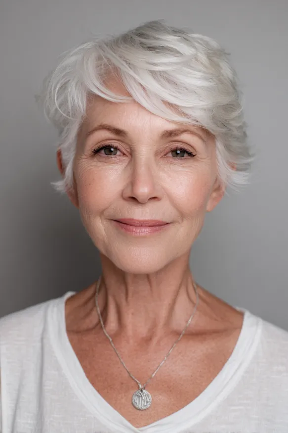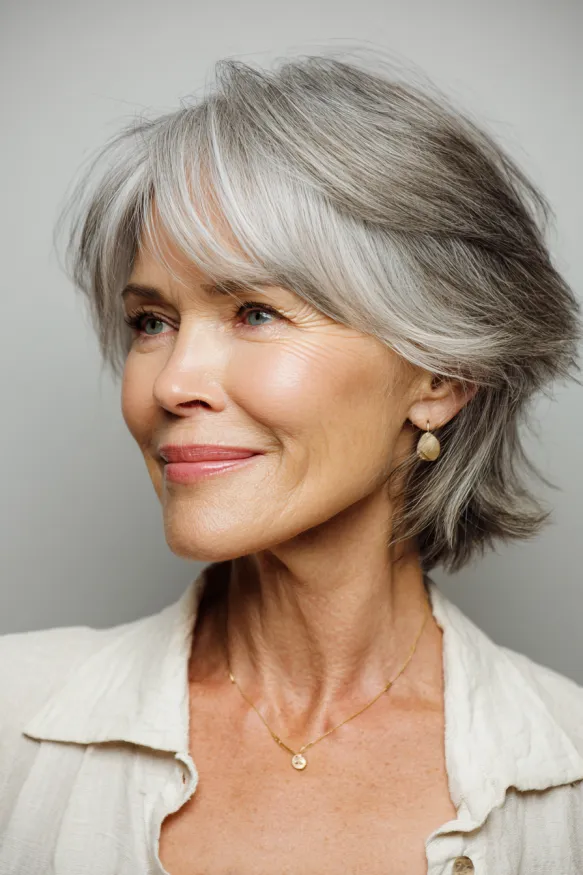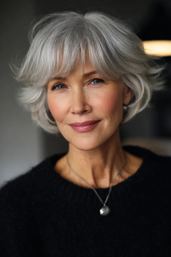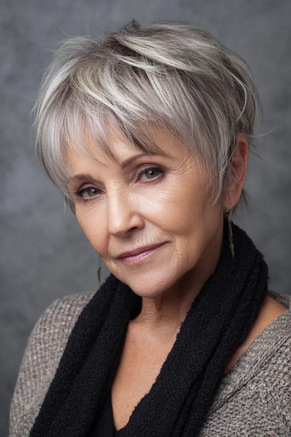 This short layered pixie is all about soft texture and movement. The layers are feathered and slightly tousled, giving it a playful yet elegant look. The icy silver tone adds a modern edge while blending naturally with gray hair, making it feel effortless and striking. The wispy bangs skim the forehead, framing the face in the most flattering way without feeling too heavy or styled.