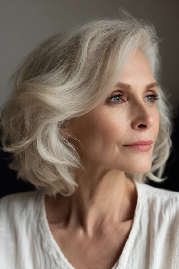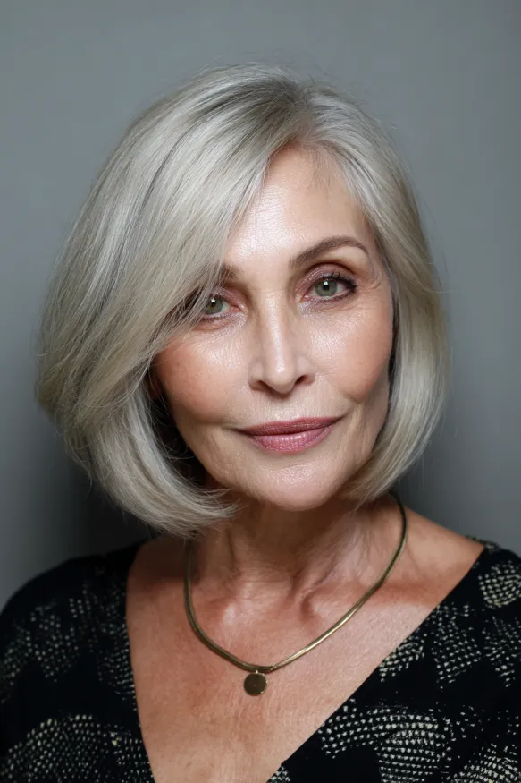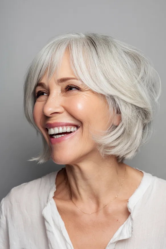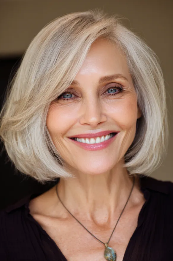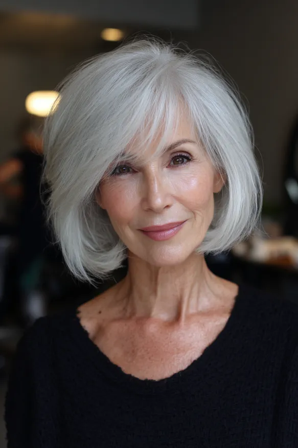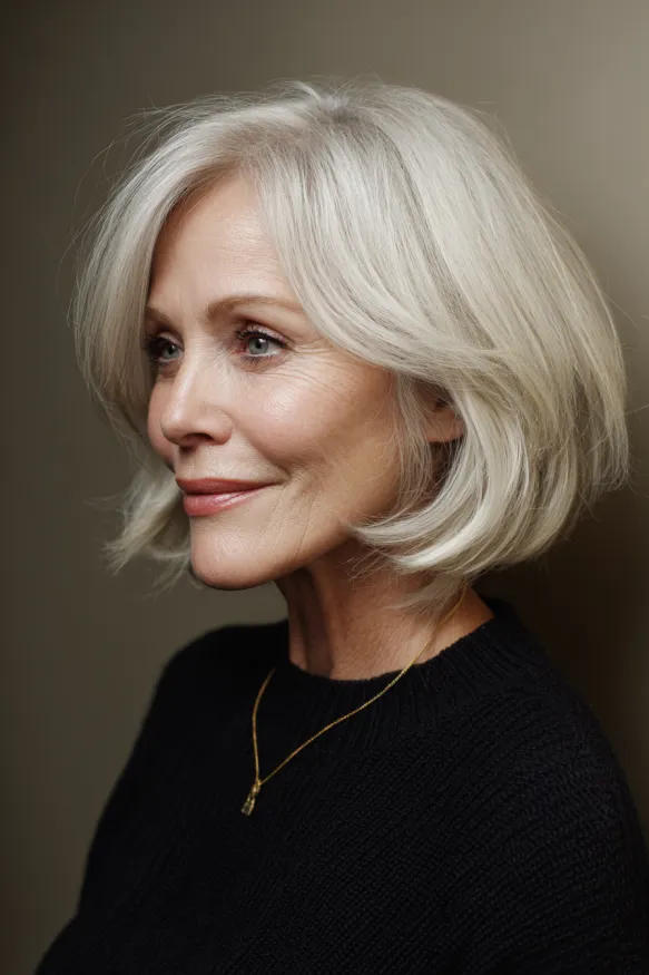 This classic chin-length bob is softly layered to create volume and movement without losing its clean shape. The side-swept bangs flow effortlessly into the rest of the cut, framing the eyes and cheekbones in the most flattering way. The silvery beige tone gives it a warm, natural glow that complements mature features beautifully.